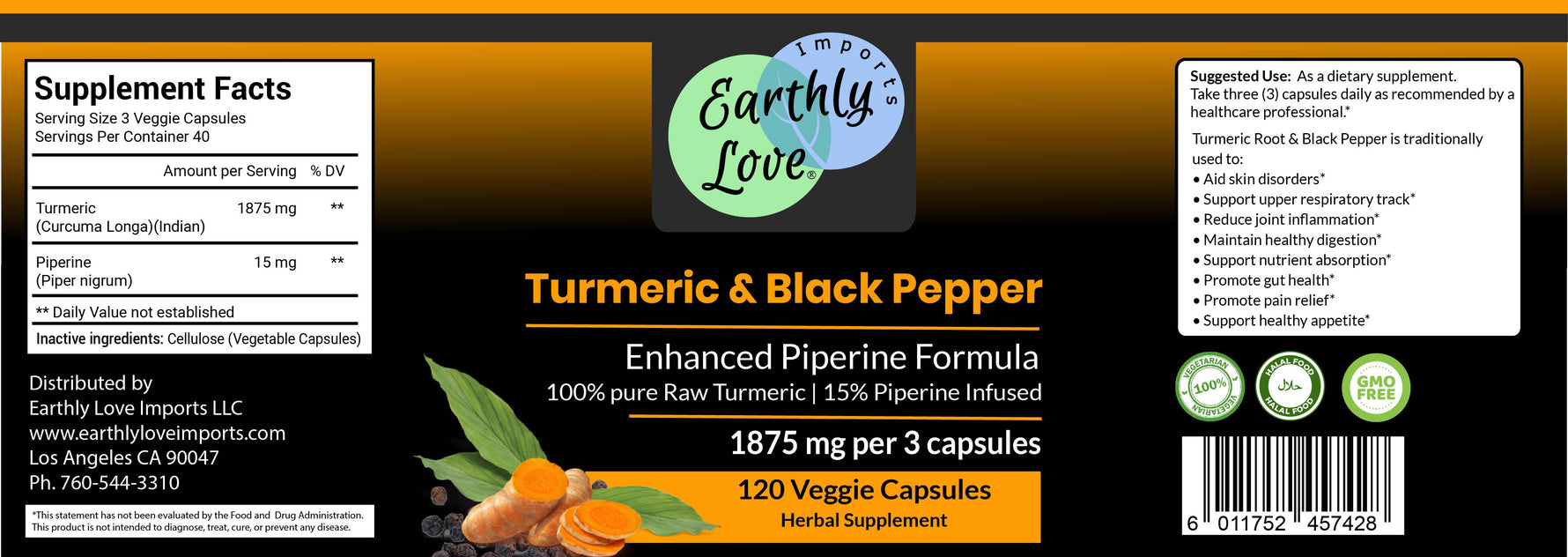 Turmeric (Curcuma longa) has been treasured in India and across Asia for centuries, valued in both kitchens and herbal traditions for its golden color and deep cultural significance. When paired with Black Pepper (Piper nigrum), its legacy of balance and vitality is carried forward in a timeless combination. Earthly Love® brings this heritage into clean, vegetarian capsules—crafted with integrity to honor tradition while fitting seamlessly into modern daily routines.