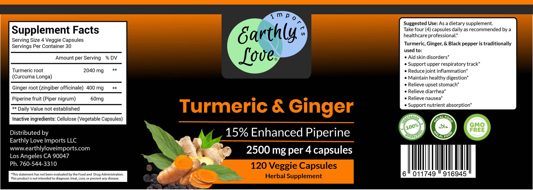Turmeric (Curcuma longa) and Ginger (Zingiber officinale) have been treasured across Asia and beyond for centuries, celebrated both in kitchens and in herbal traditions. Together, this golden root and warming spice carry a heritage of balance, vitality, and cultural depth. Earthly Love® brings this timeless pairing forward in clean, vegetarian capsules—crafted with integrity to honor tradition while fitting seamlessly into modern daily routines.