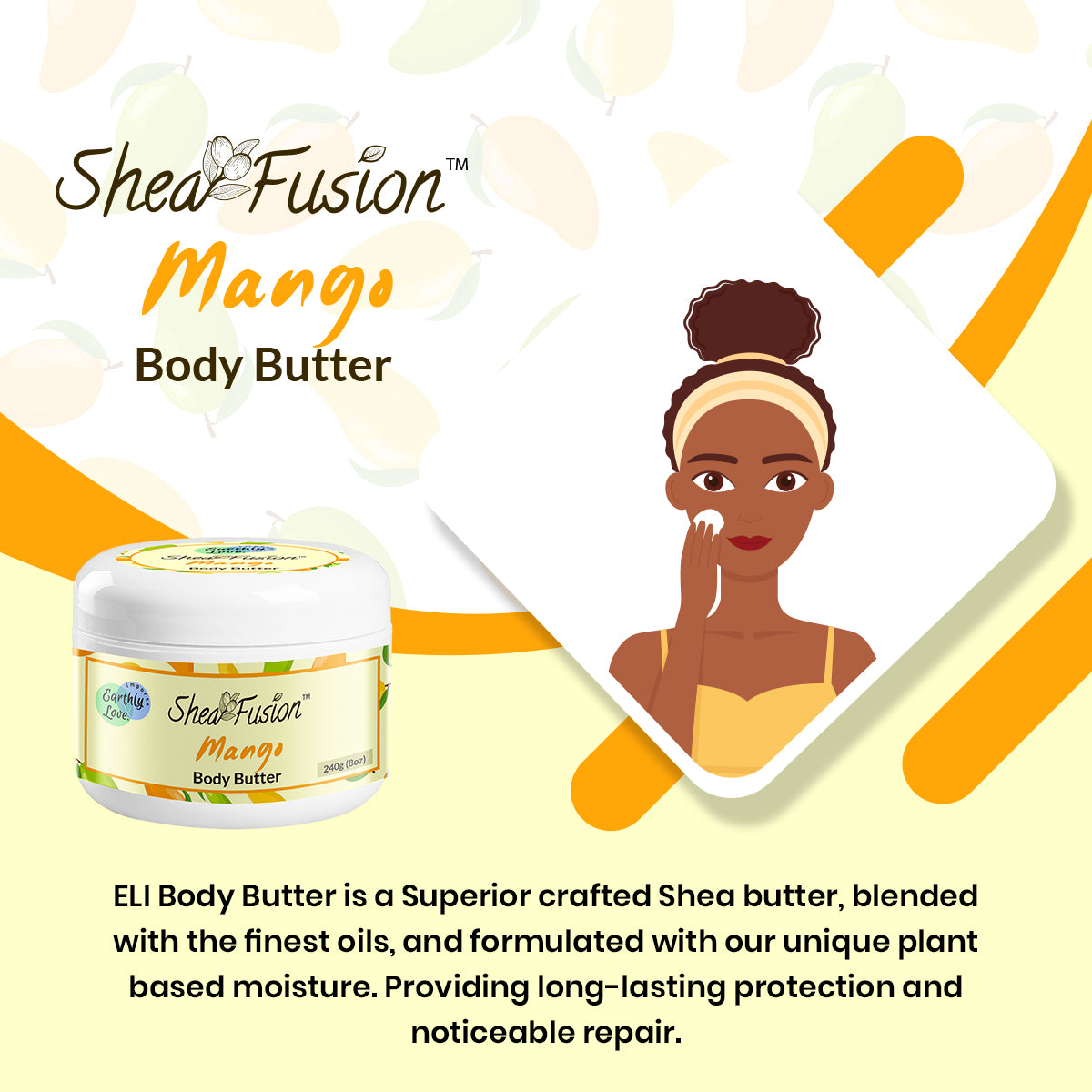 Brighten your routine with our Mango Moisturizing Butter. Handcrafted with care, this shea‑based blend is enriched with mango butter—long appreciated in traditional care practices for its naturally rich content of vitamins A and C, antioxidants, and essential fatty acids. Its velvety texture smooths on easily, leaving skin feeling soft, nourished, and beautifully maintained.
